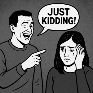 A „csak vicceltem” mondat pajzsként működik. Segít elhárítani a felelősséget, és az áldozatot hibáztatni a saját reakcióiért.